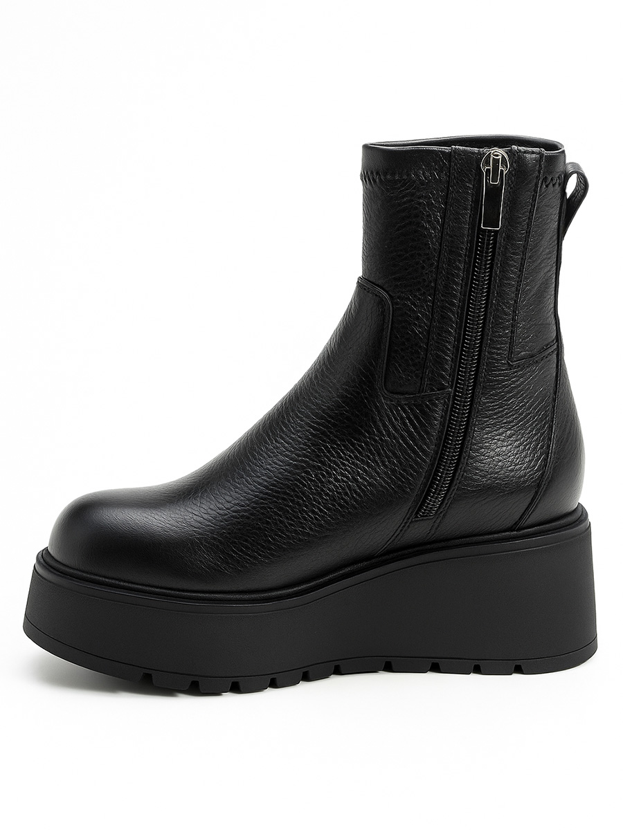 Botki skórzane Agnes to połączenie elegancji i wygody, które zadowolą każdą miłośniczkę mody. Wykonane z wysokiej jakości skóry naturalnej licowej oraz elastycznej lycry, doskonale dopasowują się do kształtu nogi, zapewniając komfort przez cały dzień. Botki wykonane są z wysokogatunkowej skóry naturalnej licowej typu groszek, co zapewnia trwałość oraz estetyczny wygląd przez długi czas. Elastyczna lycra sprawia, że buty idealnie dopasowują się do kształtu nogi, dając efekt smukłej sylwetki i maksymalnego komfortu. Stylowa koturna z bieżnikiem 8 cm tył, 3,5 cm – przód. Oprócz doskonałego wyglądu, koturna zapewnia stabilność oraz wygodę podczas chodzenia, dzięki czemu możesz czuć się pewnie w każdej sytuacji. Botki Agnes doskonale komponują się z różnorodnymi stylizacjami – od casualowych po eleganckie. To must-have w szafie każdej kobiety, która ceni połączenie modnego designu z funkcjonalnością.