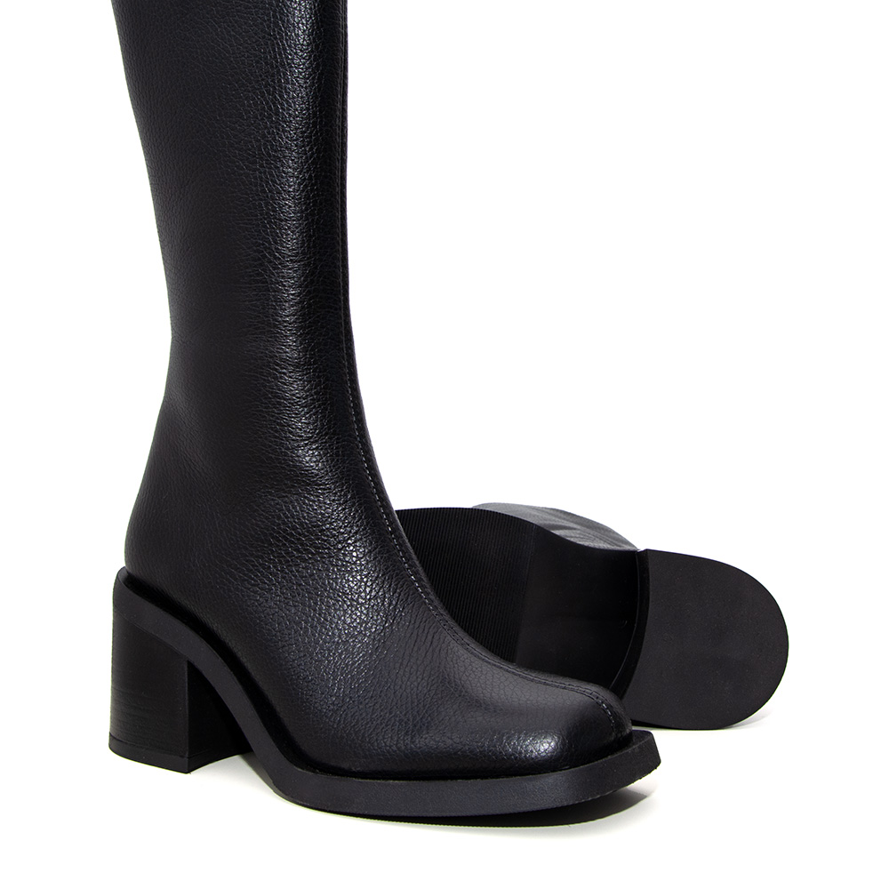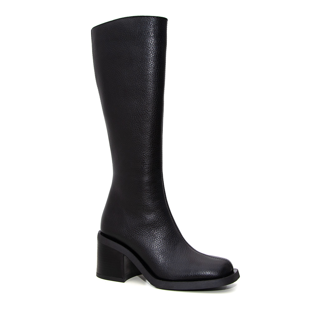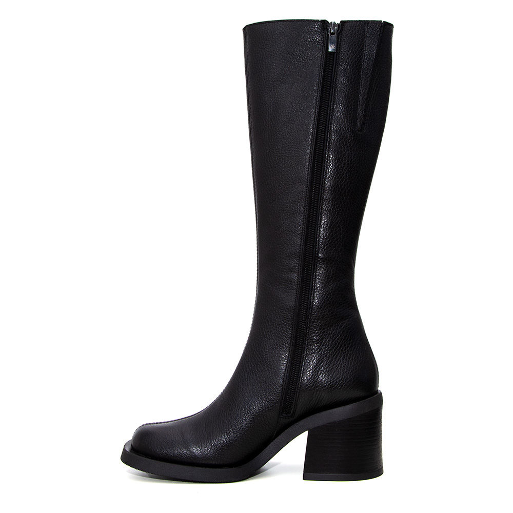 Buty bardzo stabilne dzięki zastosowaniu podeszwy z obcasem 7 cm typu „klocek”. Dzięki geometrycznemu noskowi w palcach jest więcej miejsca, a przyszwa w tęgości „G” idealnie trzyma podbicie. Kozaki ocieplane na całej długości idealnie sprawdzą się na chłodniejsze dni.