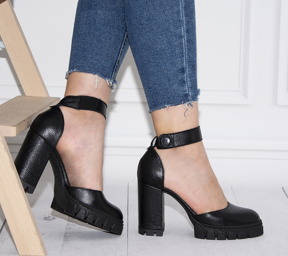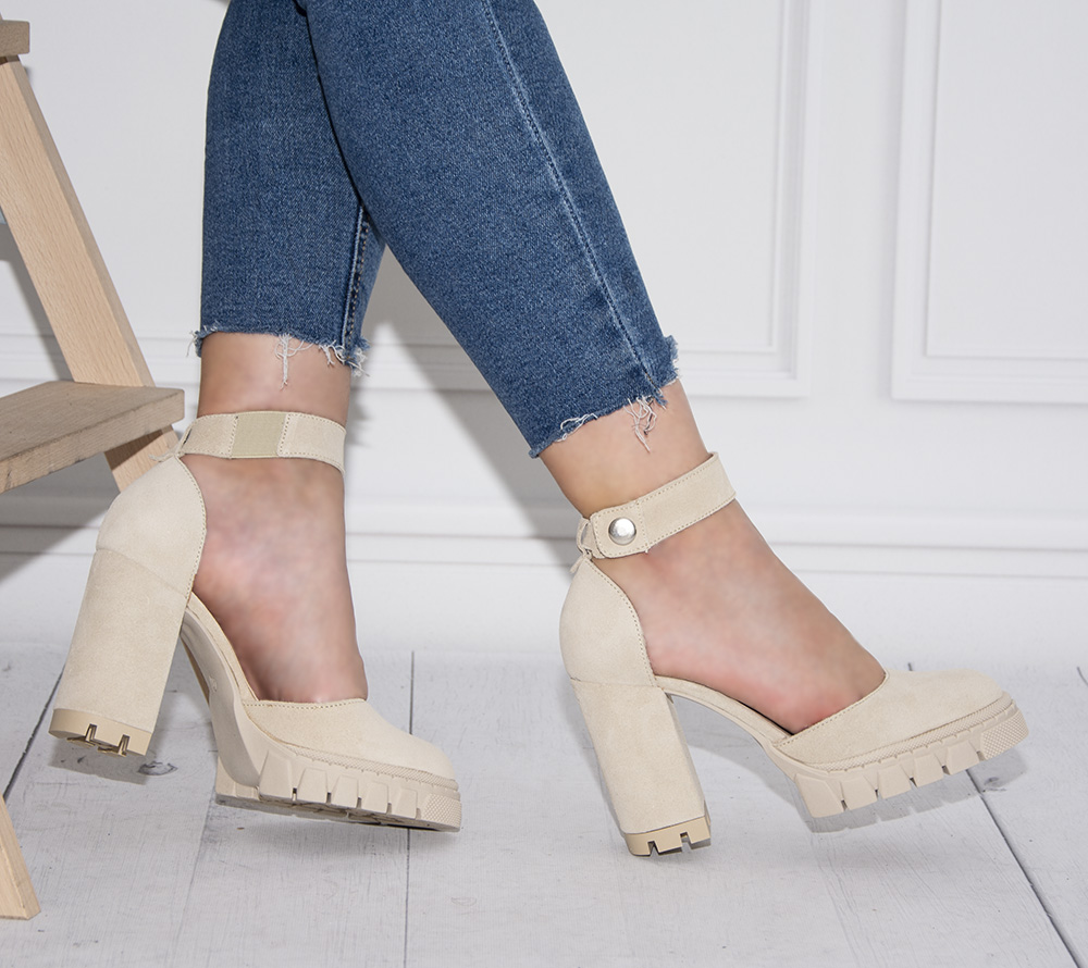 Wygodna podeszwa oraz stabilny obcas 9 cm owinięty skórą. Rozciągliwy pasek zapinany na napa.