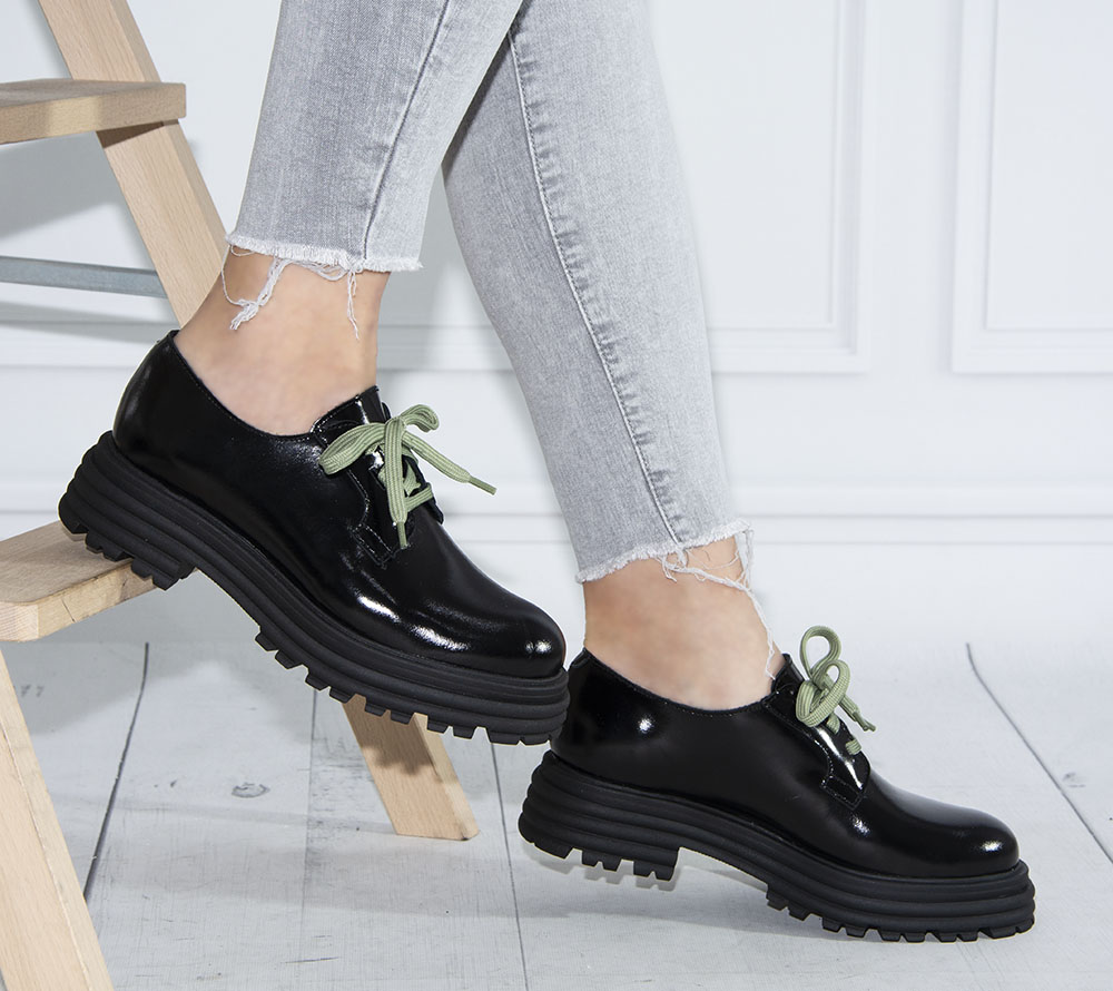 Połączenie klasyki i elegancji, zielona sznurówka sprawia, że buty idealnie wpisują się w miejską, swobodną stylistykę.