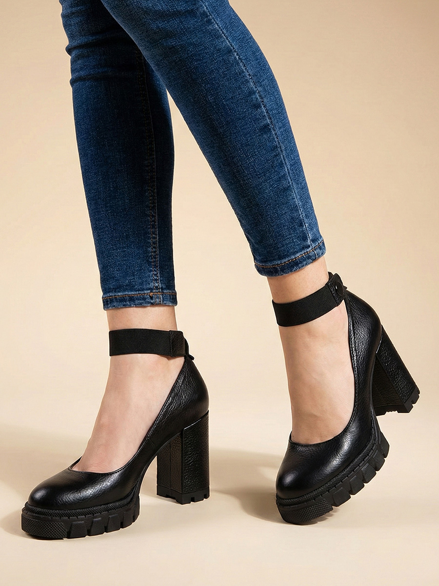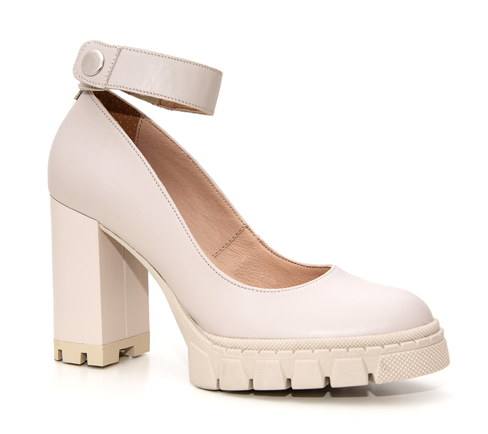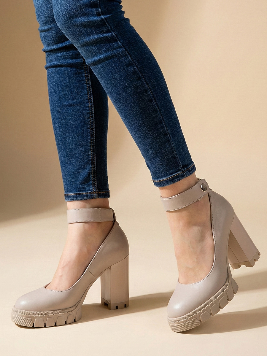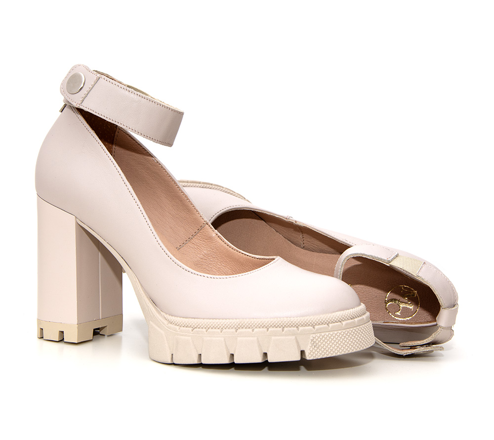 Wygodna podeszwa oraz stabilny obcas 9 cm w kolorze skóry. Rozciągliwy pasek zapinany na napa.